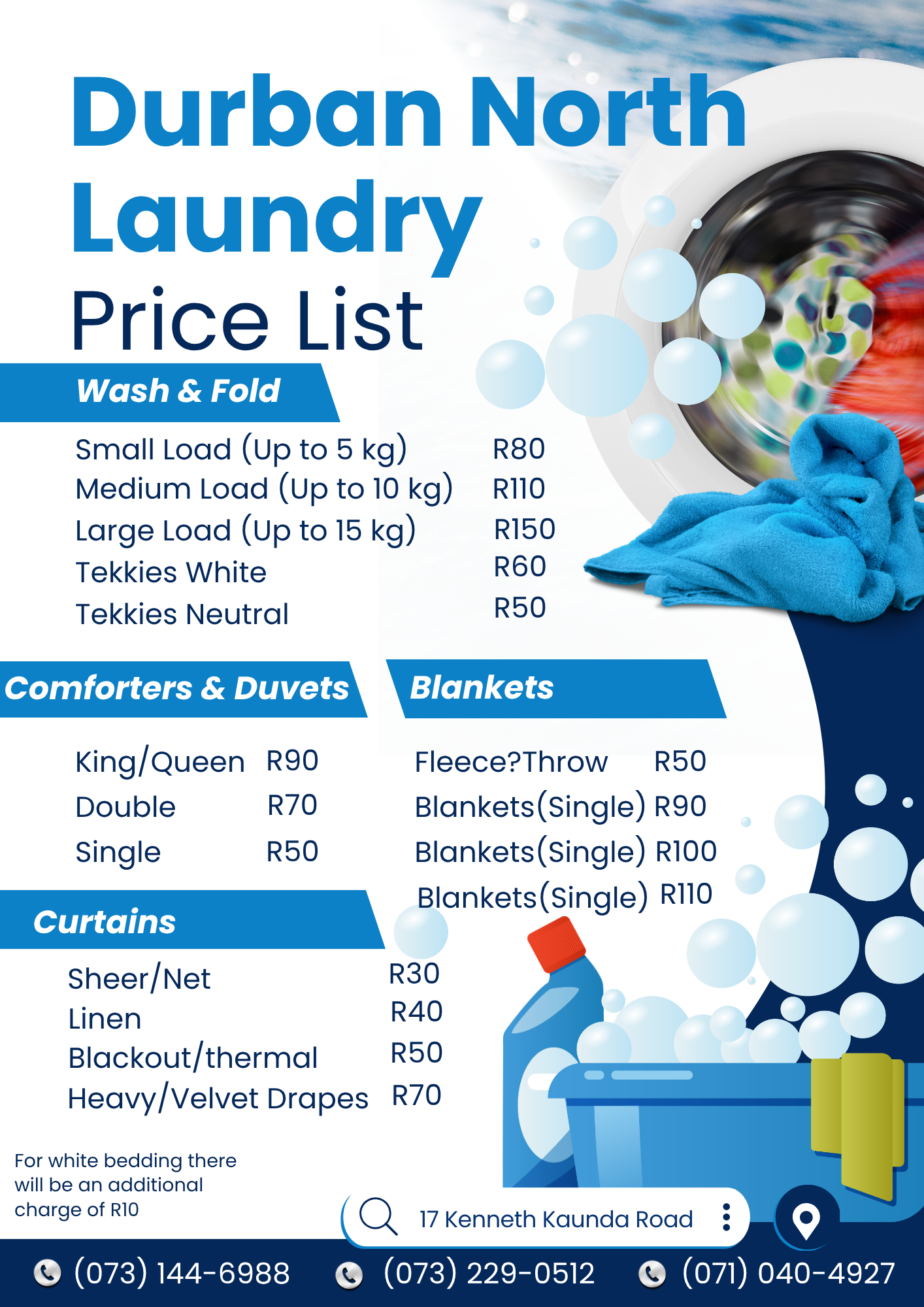 At Durban North Laundry, we understand that every customer has unique laundry needs. If you don’t see the service you’re looking for, feel free to contact us and our team will be happy to assist you. We’ll do our best to provide a solution that works for you.